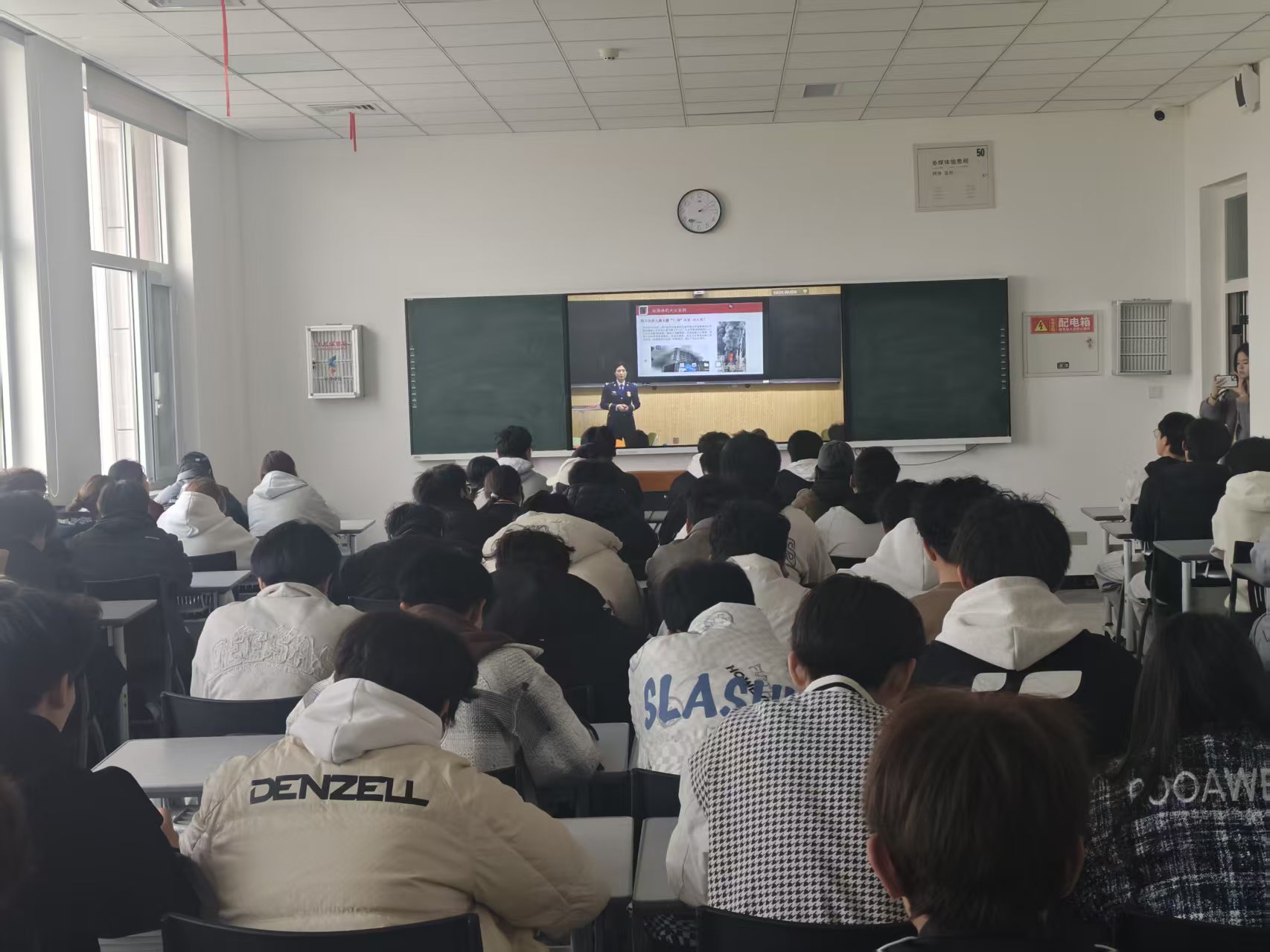 王燕监督员从典型火灾案例入手,为全体师生深入剖析火灾的危害,提高全体人员对消防安全的重视程度,之后又通过消防法律法规宣讲、消防安全常识普及、消防设施使用要点、火灾扑救及逃生四个方面进行详细讲解,线上线下的广大师生认真听讲,通过讲座汲取消防安全知识,掌握火灾自救本领,纷纷表示要向周边的亲友普及消防知识,争做消防安全的践行者和传播者。